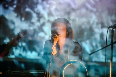 Her music is normally more electronic, with loops samples and beats providing the backing, but tonight we have a full band. The electronic parts are still there, they’re an integral part, but along with them we’ve backing vocals, a couple of guitars, bass and drums.